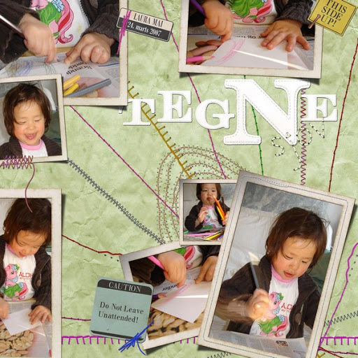 Dette LO (dagens sidste.. 😉 er til en “stitch” udfordring. Nogen af billederne har jeg scrappet før til Fasters kalender, men jeg har aldrig scrappet dem i fuld størrelse.. Jeg har egentlig vist heller aldrig haft så mange billeder på en side, men sådan var den “skitse” jeg brugte nu en gang..