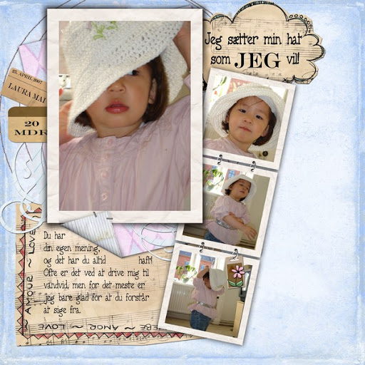 Jeg sad sådan og havde lyst til at scrappe et eller andet, og disse billeder kom frem af gemmerne.. Martin hader hatten, men jeg synes den er såååå sød. Om hun skal have dem på eller ej er bare desværre ikke op til os. Det styrer hun helt selv, og det endda med temmelig hård hånd!