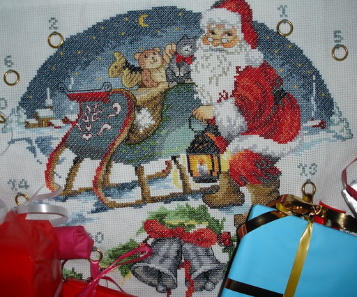 Min mor troede ikke i sin vildeste fantasi at jeg nogensinde ville BRODERE en julekalender, men det er nu altså hvad jeg har gjort.. Jeg blev ikke færdig til tiden dog, for der kom også lige lidt mad ind over, som tog lidt tid.. 😉 Det skal nu også siges at jeg fik idéen temmelig sent.. Jeg tror nok jeg købte pakken med tarn og mønster og det hele d. 12. nov. så jeg havde liiidt travlt hvis jeg skulle ha’ været færdig inden 1. dec.. Laura er nu også temmelig ligeglad, og der er da heller ikke heeelt fyldt op med pakker endnu, men mon ikke det kommer.. 😀