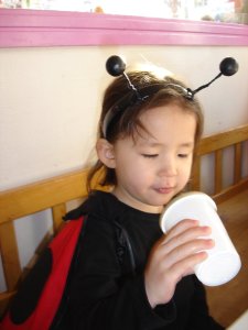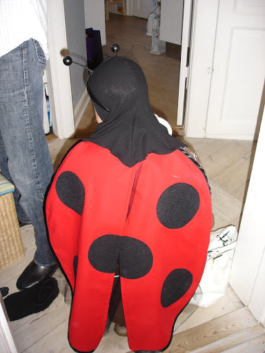 Laura var mariehøne i år. Jeg havde selv bikset kostumet sammen med vinger og hætte og det hele. Det var lavet sådan at hun kunne have det uden på flyverdragten når vi var ude, og også bare udenpå det almindelige tøj når vi var inde.