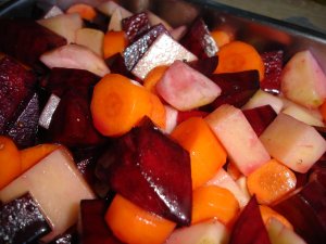 Hvis nogen skulle have lidt problemer med at genkende sagerne er der tale om rødbeder, gulerødder, kartofler og jordskokker.. Men stort set alle rødder er lækre med honning. 😀