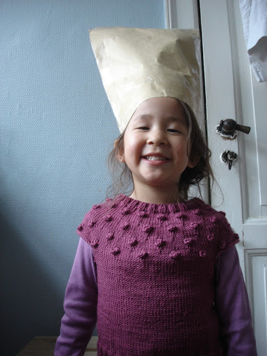 Her ser man verdens gladeste nisse. Det var i hvert fald hendes eget udsagn da hun tog “hatten” på. Hatten er i virkeligheden den kuvert som den fine striktop kom i. Mormor har strikket den på bestilling, og det er altså hurtig ekspedition skal jeg hilse og sige. 1 uge gik der fra vi handlede garnet til trøjen er på. Tak for kaffe!