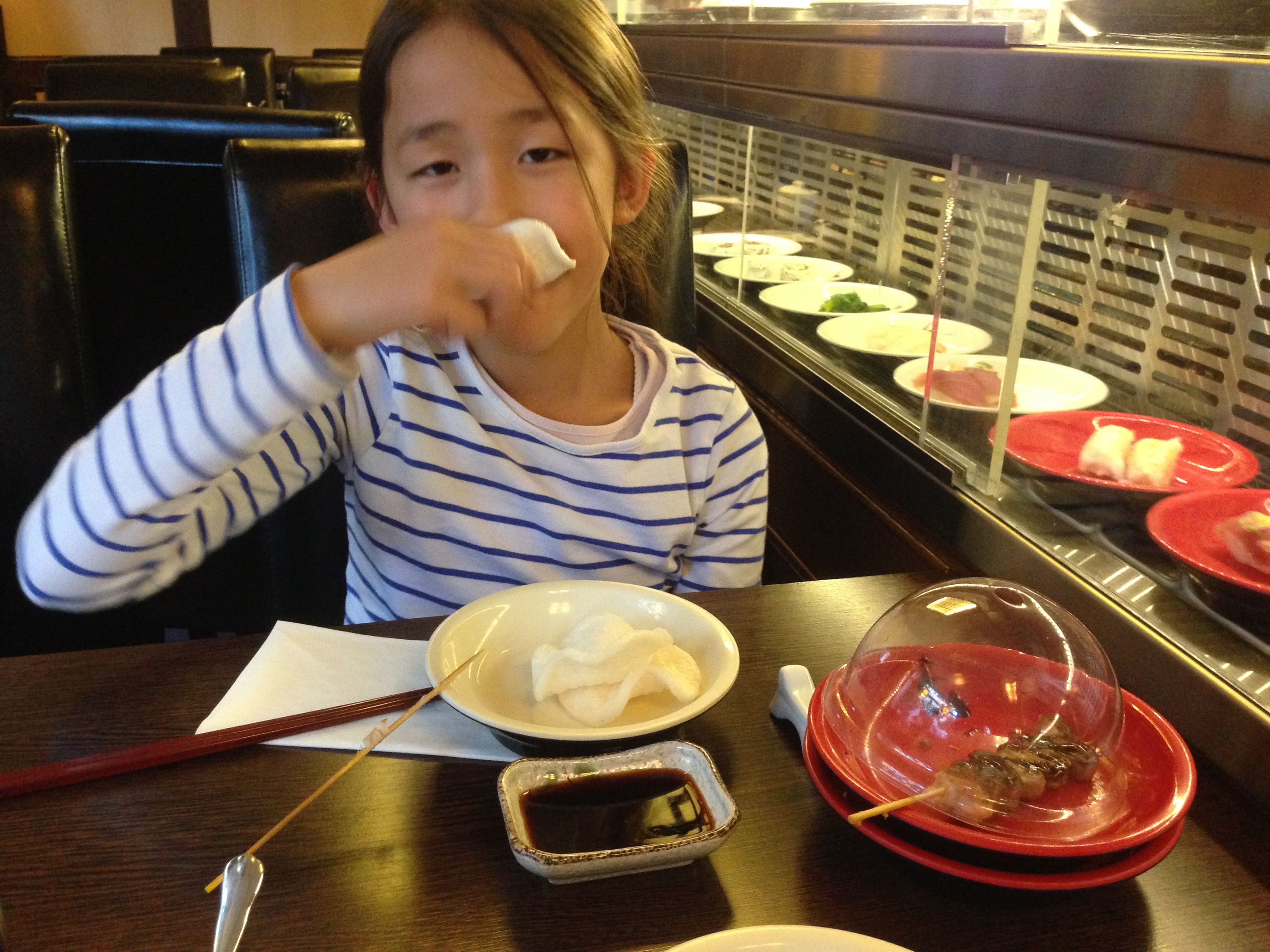 De første par gange Gåsen spiste running sushi, var det udelukkende rejechips og nigiri med reje hun valgte , men hun er efterhånden blevet ret modig, så nu er det langt mere økonomisk rentabelt, at vælge running sushi, når vi skal spise ude. Rejechipsne og førnævnte nigiri er stadig et must have, men jeg var faktisk overrasket over, hvor meget forskelligt hun havde mod på denne gang.