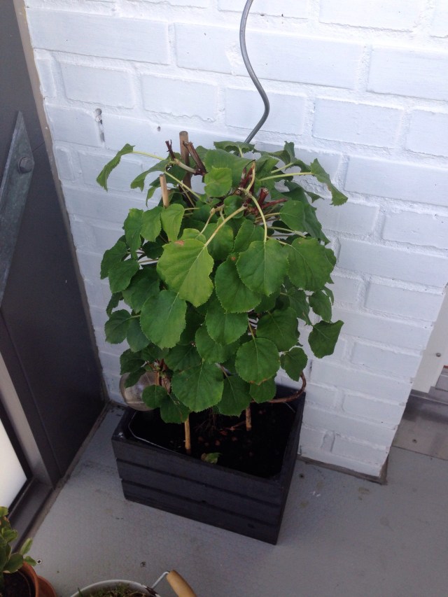 Til kasserne på gulvet ville jeg gerne have noget der kunne klatre, men som ikke ville overtage altanen totalt. Planteskolemanden lovede mig, at jeg kunne klippe i den lige så tosset jeg ville, så vi kom hjem med en klatrehortensia.