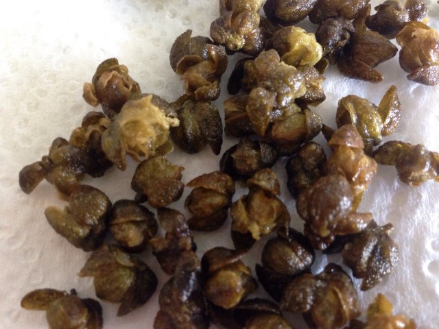 Vidste du, at kapers er uåbnede blomsterknopper fra kapersbusken? Når man friterer dem springer de ud – de store af dem kan endda være lilla inden i. Min veninde Mette kaldte dem engang for “sjovt salt” fordi de mister meget af syren fra eddikelagen når de friteres, og du står tilbage med små sprøde salte knopper – perfekte til f.eks. en lille tunbruschetta.