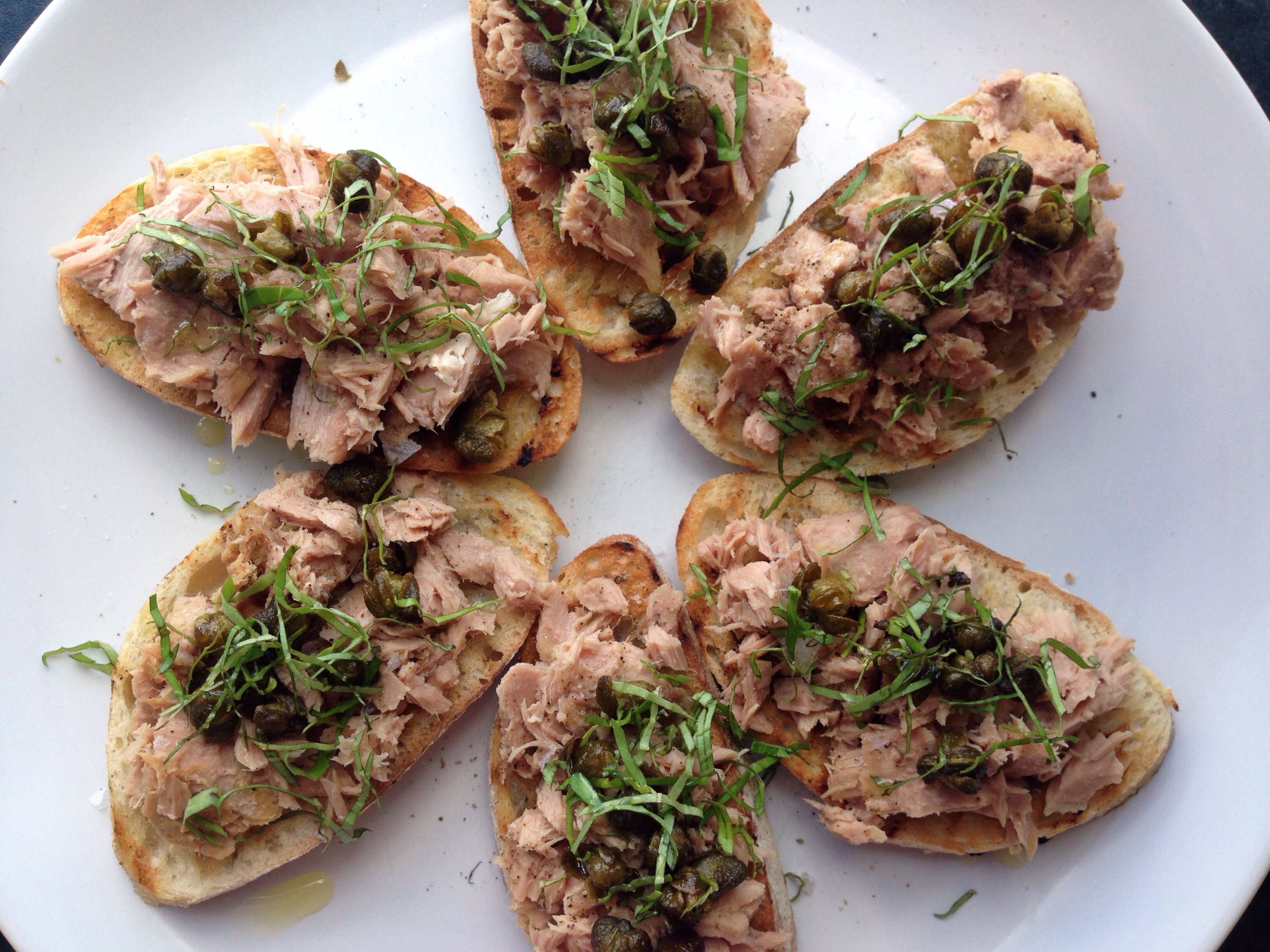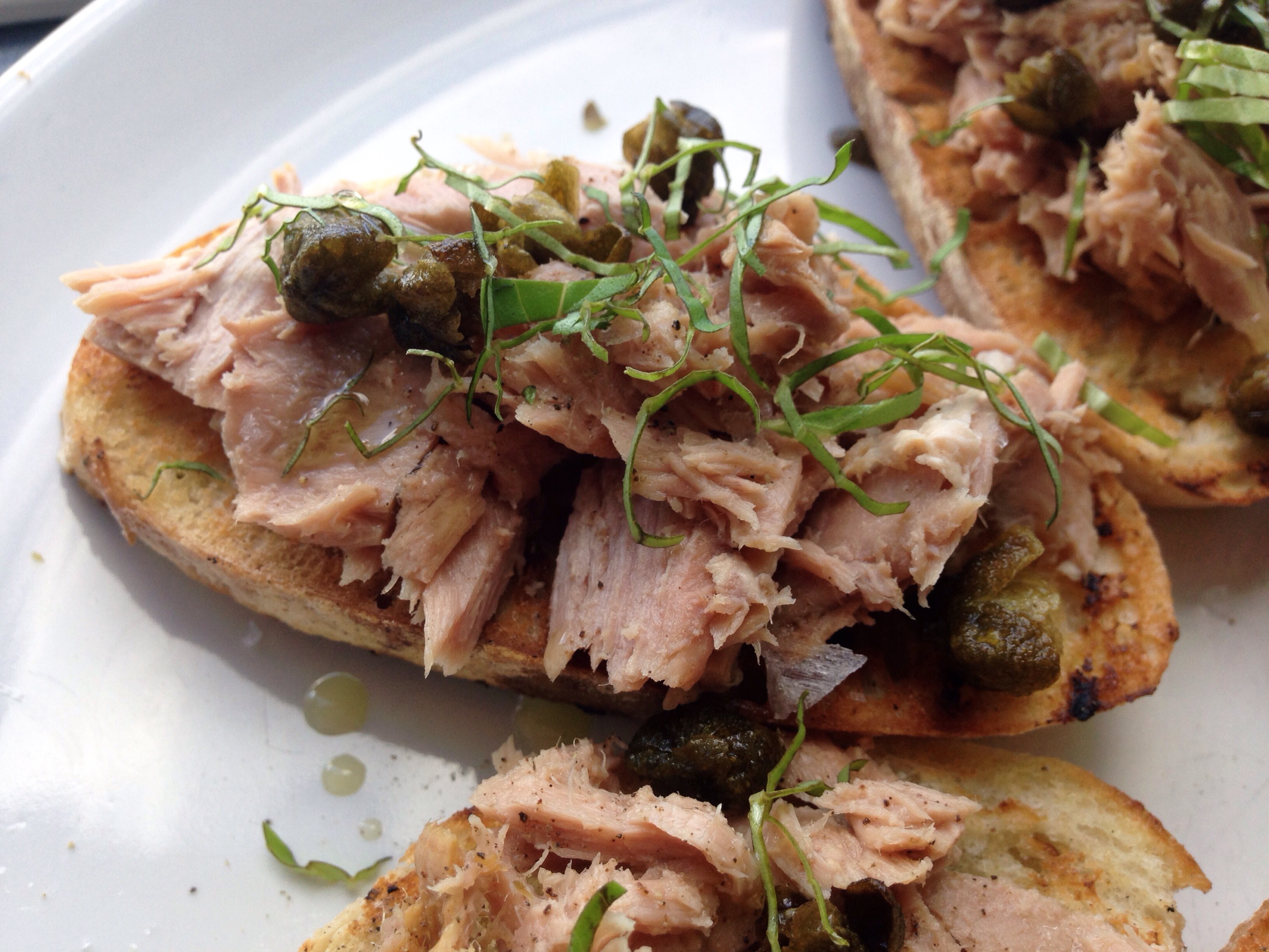 Dræn tunen og fordel det på brødet, krydr med salt og peber og dryp lidt olivenolie over. Pynt med kapers og chiffonade (helt tynde strimler) af basilikum.