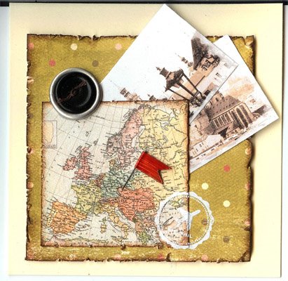 Dette var til en fødselsdagsgave til Mettes forældre som fik en rejse til Prag. Postkortene er billeder fra nettet der er blevet ældet lidt. Landkortet er også fra nettet og papiret er vist nok noget Wild Asparagus og fly-rubon’en er fra BG.. Dimsen under knappen er sådan en “ramme brad” som jeg tror er fra MM, men hæng mig ikke op på det!