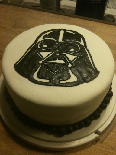 Martin havde en intern joke på arbejdet, så han spurgte om ikke jeg kunne lave en Darth Vader kage.. Oprindelig ville jeg ha’ lavet en 3D kage, bare af hjelmen, men jeg kom frem til, at jeg hellere ville have lidt mere fyld i, så jeg endte med tre lag chokoladekage. Det midterste af lagene blev bagt med macademianødder i dejen. Først penslede jeg kagelagene med Drambuie, og så var der ellers dømt frosting for alle pengene. Jeg havde lavet en stor røvfuld chokoladefrosting og delt det op, så jeg havde til både fyld og til at smøre udenpå. I det ene lag havde jeg blandet Marabou med crispy bits, og det andet havde jeg blandet lææækre amarena kirsebær i. Endelig overtrak jeg hele baduljen med hvid sugarpaste, og lavede en sort Darth Vader run-out. Glasuren drillede lige rigeligt, men jeg synes egentlig det endelige resultat blev ok.